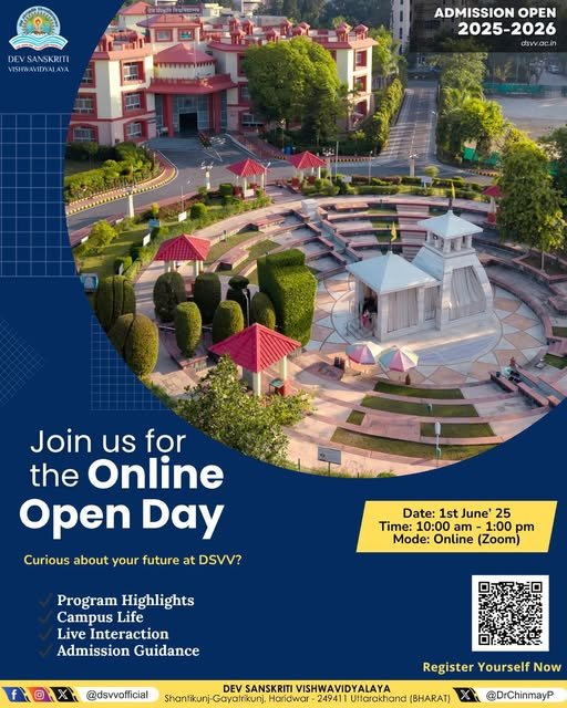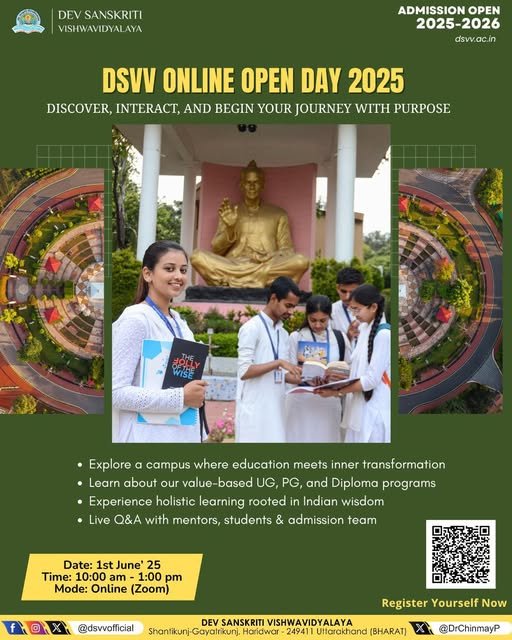DSVV ONLINE OPEN DAY 2025 Discover the campus where education meets inner transformation. Join us virtually on 1st June, 2025 | 10:00 AM – 1:00 PM ✨ Live interaction with faculty, students & mentors ✨ Explore UG, PG & Diploma programs rooted in Indian wisdom ✨ Q&A to guide your academic journey